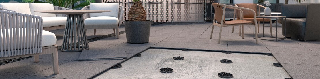 Een tegelvloer verhogen met 2 tot wel 950 mm? Geen probleem! U heeft de keuze uit vaste en verstelbare tegeldragers van rubber of gerecycled polypropyleen kunststof dat tegen bijna alle weersinvloeden bestand is. Standaard geleverd met voegbladen met een voegbreedte van 3 mm, maar als u grotere tegels gebruikt en meer afwatering wenst, kunt u ook voor 5 mm voegen kiezen. Hellingen tot wel 14% (afhankelijk van de gebruikte drager) kunt u optioneel corrigeren met hellingcorrectoren die u eenvoudig op de kop of onder de voet van de tegeldrager kunt plaatsen.